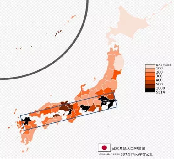 日本的“胡焕庸线”是一个倾斜的矩形。矩形内的关东平原(东京)、浓尾平原(名古屋)、近畿平原(大阪、京都、神户)、濑户内海沿岸和九州岛的福冈,是日本人口最密集的区域。