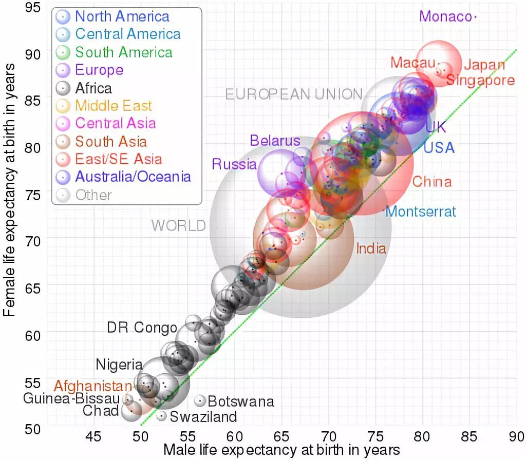各区域男女预期寿命对比(来源:美国中央情报局)