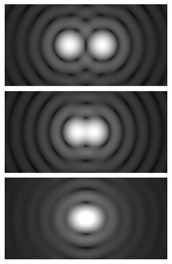 光由波组成,就像水流经过狭窄的桥之后,会散播开来,光穿过狭缝后,也会传播开来,也就是所谓的光的衍射。这会导致光波彼此干涉,产生衍射图样,正如著名的双缝实验所证明的那样。当光这样传播时会产生一个艾里斑(airy disc),也就是光线穿过圆孔后聚集程度的极限