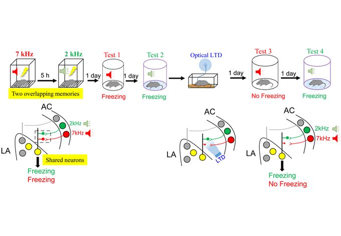 Mice were exposed to two auditory fear conditioning, separated by 5 hours. Both memories were encoded by shared neurons in the lateral amygdala while they were encoded by different neurons in the auditory cortex. Mice showed freezing behavior in response to 7kHz and 2kHz tones.Induction of optical long term depotentiation (LTD) to synapses specific to 7kHz fear memory, erased only that memory (test 3) without affecting the other memory (test 4) that was stored in shared neuron ensemble.