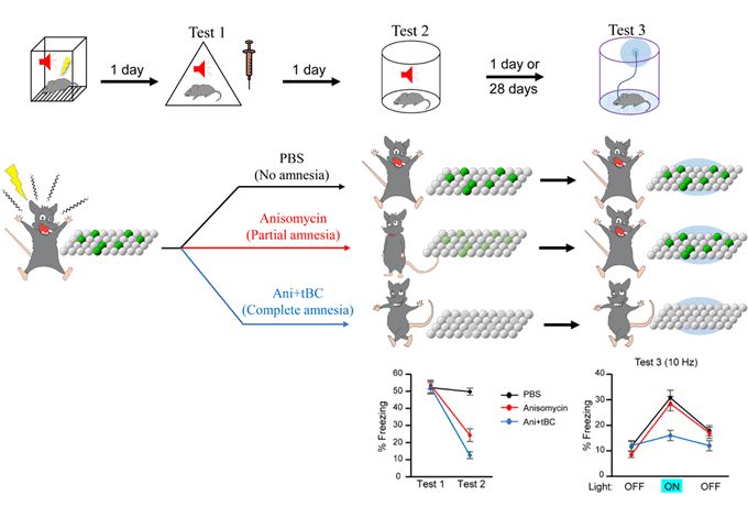 Mice were exposed to auditory (7 kHz) fear conditioning. They received injection of phosphate buffered saline (PBS) or anisomycin or anisomycin+tat-beclin (Ani+tBC), after recalling the memory (test 1). PBS-treated mice showed higher freezing response while anisomycin-treated mice showed partial decrease in the freezing response (partial retrograde amnesia), whereas Ani+tBC induced complete retrograde amnesia (test 2). Optogenetic activation of the neurons, storing the 7kHz fear memory, induced freezing in the PBS and anisomycin groups, while the Ani+tBC group continued to show complete retrograde amnesia (test 3).