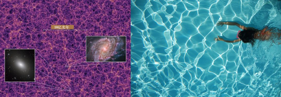 ►图5左图:在宇宙原初随机扰动下演化形成的大尺度结构宇宙网(Millenium Simulaiton);右图:随机扰动下的游泳池纤维网,此图也可叫做Zeldovich的透镜,与宇宙网的成因有异曲同工之妙(见[11])。