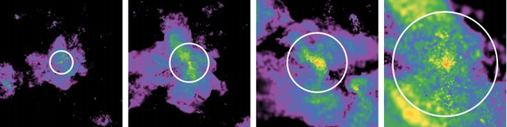 ►图8:最新的数值模拟[10]显示,随着时间的推移(从左到右),金属(不同颜色)会被星系逐渐抛出到宇宙中,星系对周边环境加热,宇宙中的金属含量增加。