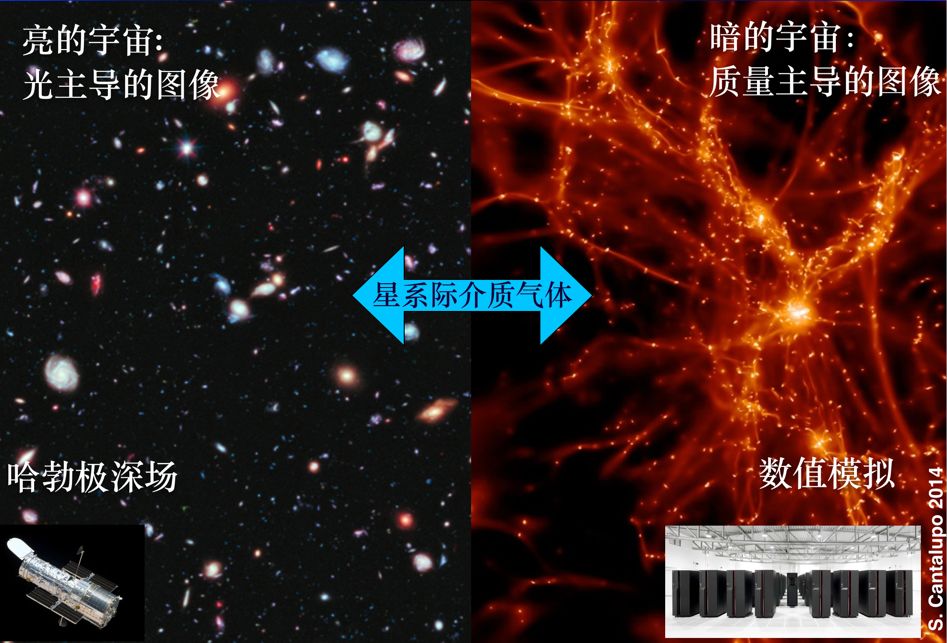 ►图6:光主导图像和质量主导图像对比 ,星系之间由宇宙网相连接,图片源自引文[6],略有改动。