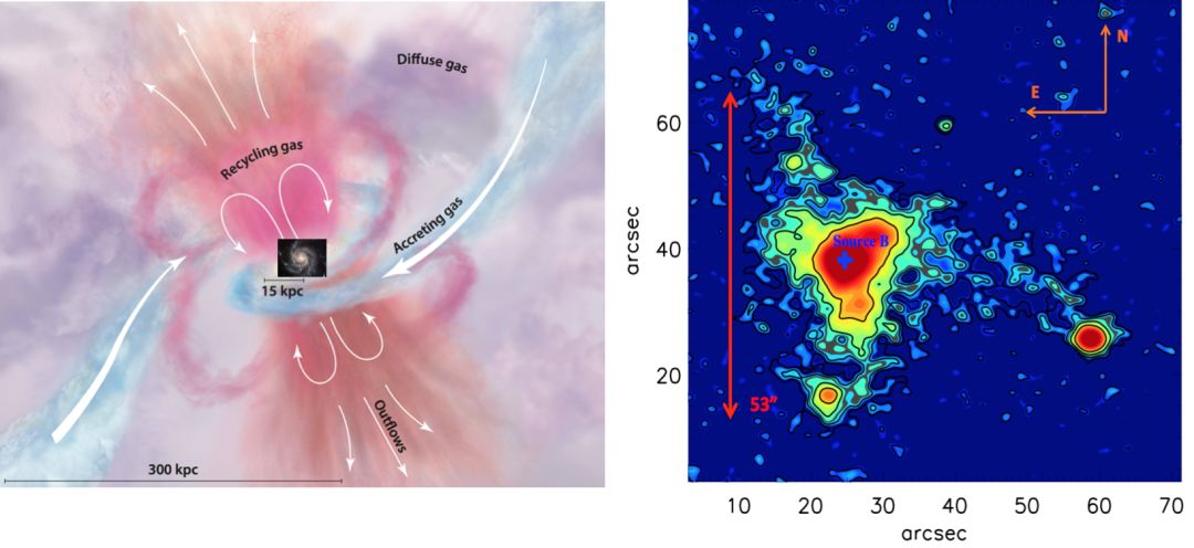 ►图7:左图为艺术家和科学家合作的星系与环境生态系统。右图为观测实例: 远超暗物质晕尺度的超大星云,这样的大星云可能是我们对宇宙网直接成像的早期尝试[5]。