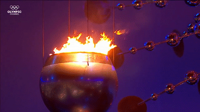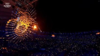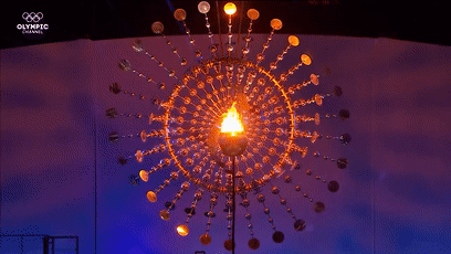 有了气流,Howe的雕塑也就可以发动了,四散的扇叶不断将火光反射出去,形成了一个以圣火为中心,不断循环发光的「太阳」。这一幕,相当惊艳: