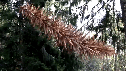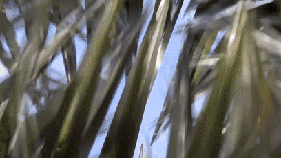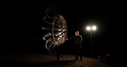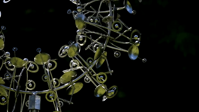 不过Howe的雕塑并不需要强风,风速只需要能吹动树叶就能够让整个雕塑系统运转起来。虽然下面这副作品摆动的很骚气,但从背后的叶子不难看出风速并不大。