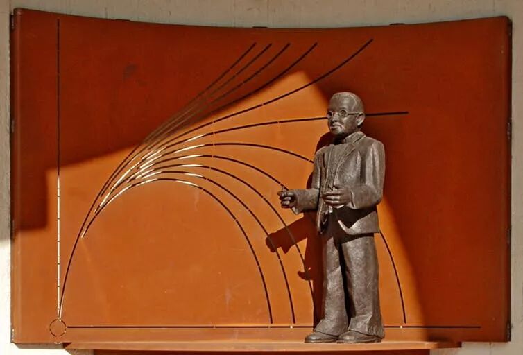 ○  乔治·勒梅特(1894-1966)在比利时的纪念雕像。勒梅特认为宇宙始于一个原初的“超级原子”或者说“宇宙蛋”的灾难性爆炸,这个理论经过乔治·伽莫夫的修改而成为现代的大爆炸理论。除了宇宙膨胀的工作,勒梅特还研究过宇宙射线和三体问题。| 图片来源:Wikimedia/EmDee