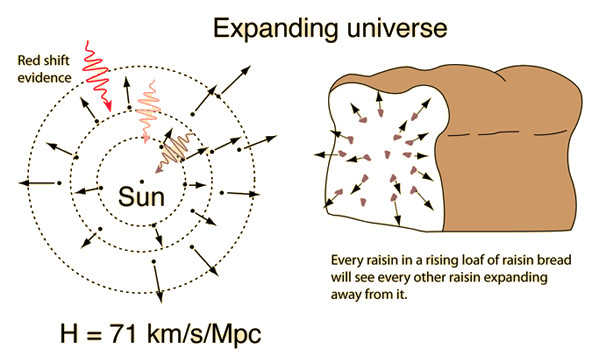 ○  我们可以把膨胀的宇宙想象成一块膨胀的面包。在烘烤过程中,面包会不断膨胀,因此面包中的葡萄干之间的距离也会彼此远离,就好比宇宙中的星系彼此远离一样。| 图片来源:Hyperphysics