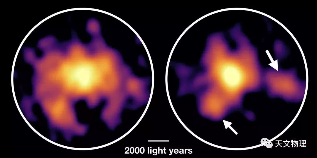 Tadaki和他的团队发现cosmos - aztec1 -1富含恒星的成分,但要弄清星系中宇宙气体的性质仍然很困难。利用ALMA的高分辨率和高灵敏度观测星系,获得了气体分布和运动的详细地图,从而制作出了迄今为止分辨率最高的遥远巨怪星系分子气体地图。Tadaki解释说:“我们发现在离中心几千光年远的地方有两个明显的大云层。”在大多数遥远的星爆星系中,恒星都是在中心形成的。