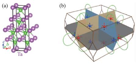 图2 在非中心对称TaAs家族中预言存在外尔费米子(a)TaAs晶体结构;(b)晶格动量空间里外尔节点的分布,红、蓝小球代表不同手性的外尔节点