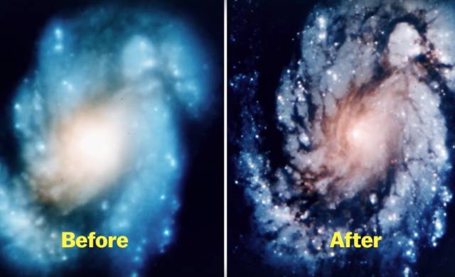 ○ 哈勃太空望远镜在发射后传回来的画质模糊(左),右边为修复后的。