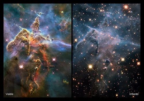 ○ 可见光(左)下的船底座星云和红外线(右)下的。| 图片来源:NASA/ESA/M. Livio & Hubble 20th Anniversary Team (STScI)NASA/ESA/M. Livio & Hubble 20th Anniversary Team (STScI)