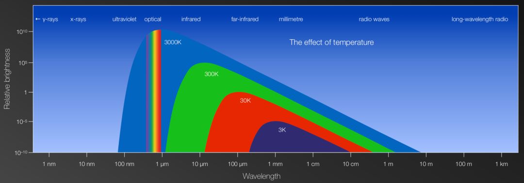 一颗红矮星的温度大约是3000度左右(上图蓝色曲线区域),我们可以看到它会辐射出大量的可见光(在蓝色区域的彩虹条)。当物体的温度逐渐降低时(如图中的绿色、红色、深蓝色区域),我们几乎见不到可见光,物体释放出的光的波长都比较长。因此,如果我们想要研究低温的现象时,我们需要进入红外线。