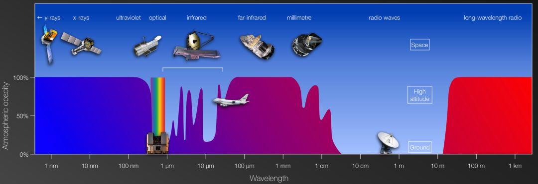我们需要把望远镜发射到太空中去还有一个重要的原因,那就是地球的大气层并不是在所有的波长下都是透明的。电磁辐射会被大气中的一些气体(比如水蒸气、二氧化碳、氧气)反射和吸收。有一些辐射可以穿过大气直达地面,比如可见光(因此我们肉眼可以在夜晚看到星星)和射电波(通过射电波段,科学家可以追踪在电子是如何被加速的,以及宇宙中氢气的分布)。而一些高能波长,比如伽玛射线(在中子星、超新星爆发等极端环境中会辐射大量的伽玛射线)、X-射线(来自炽热的物体,或落入黑洞的物质)就会被大气阻隔,因此需要在太空中进行观测,比如著名的费米伽玛射线太空望远镜、钱德拉X-射线太空望远镜等。