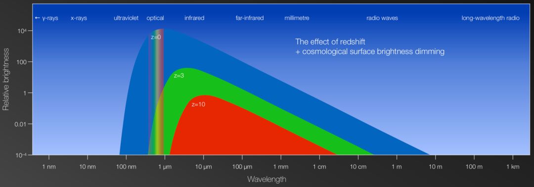光线传播是需要时间的,因此我们看的越远,就代表我们看到的是越早期的宇宙。由于宇宙的膨胀,那些在宇宙早期诞生的恒星辐射出来的光,在到达地球的时候,光的波长会被拉长,我们说光红移了。