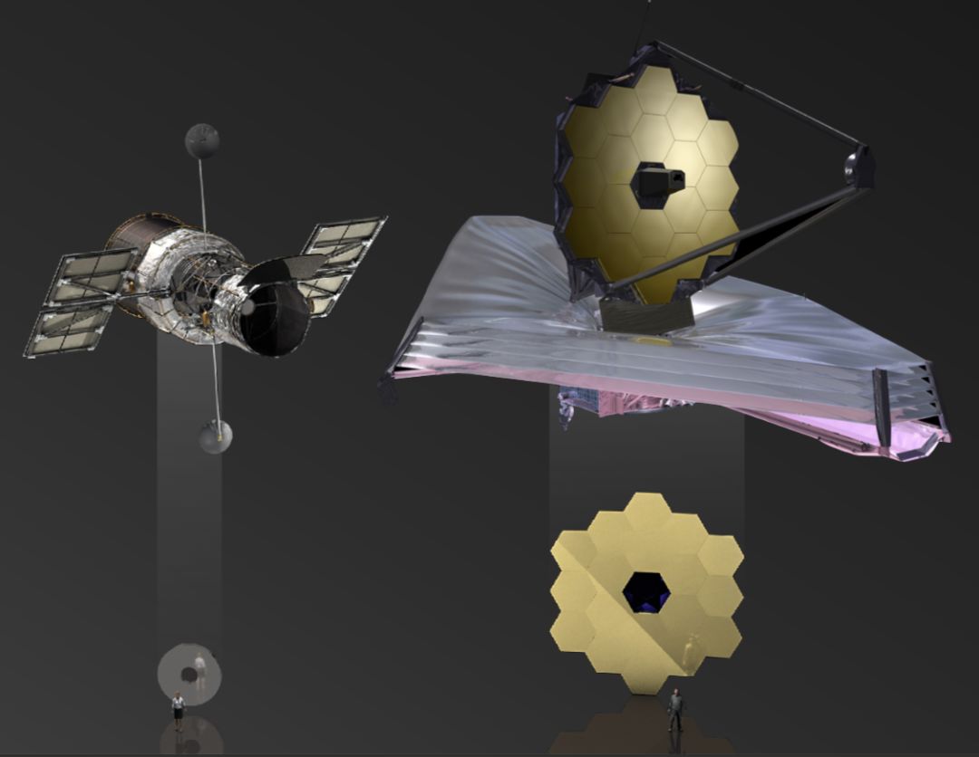 ○ 左:哈勃太空望远镜(HST);右:詹姆斯·韦伯太空望远镜(JWST)。| 图片来源:NASA/ESA/CSA