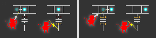 图1:单电子麦克斯韦妖:系统是只含一个电子的盒子,与一个外势场相连。麦克斯韦妖监控着盒子所带的电荷,如果一个电子(蓝色)进入盒子,妖精就会立即施加一个正电荷把它束缚在里面(左),而如果电子离开盒子,妖就施加一个负电荷把它困在外面(右)。这个系统与麦克斯韦所设想的通过开关门的方法把速度快的粒子和速度慢的粒子隔开的系统等价。
