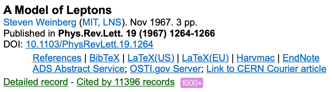 ○ 《轻子模型》是理论物理学史上被引用最多的论文之一,截止今天为止共被引用了11396次。| 图片来源:Inspirehep