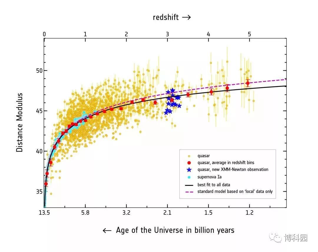 这些光源的光在到达我们之前已经传播了100亿年了。在浏览了这些数据并将样本缩小到1600个类星体之后,天文学家们得到了最好的观测结果,从而得出了他们可以用来研究宇宙膨胀的距离的可靠估计。当我们把跨越近120亿年宇宙历史的类星体样本与只覆盖过去80亿年左右的ia型超新星局部样本结合起来,发现在重叠的时代中也有类似的结果。