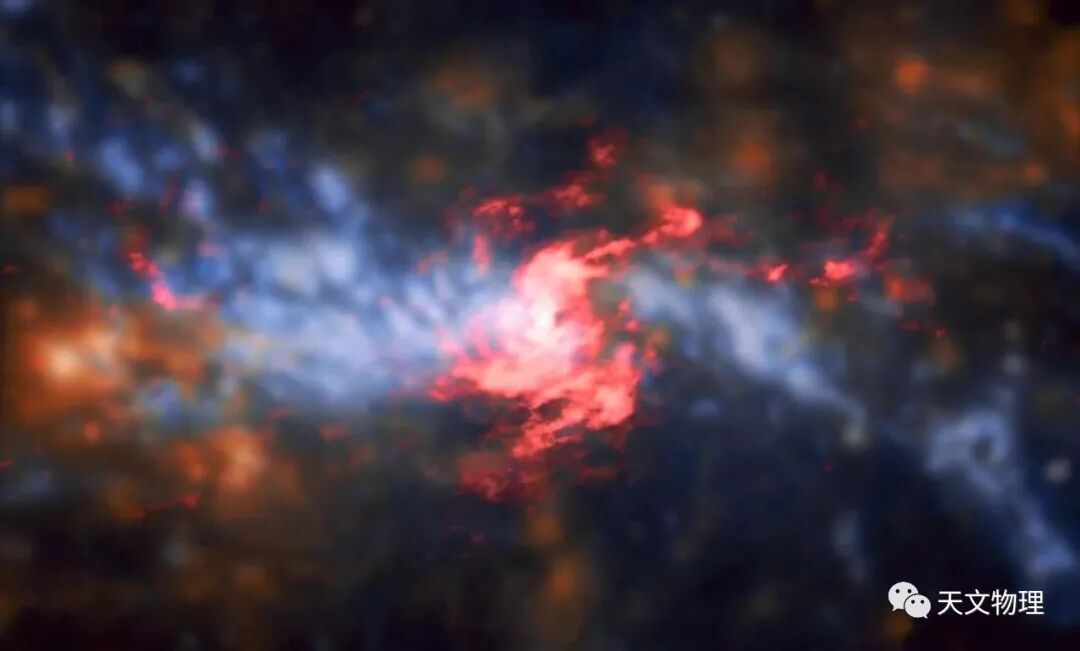 去年ALMA在其原子核中发现了一个大约80光年宽的细长结构(大约200光年宽,由较冷的分子气体成分发射)。科学家们提出,这种结构就是预期的AGN环面,以及导致AGN模糊和射流准直的相关分子材料。