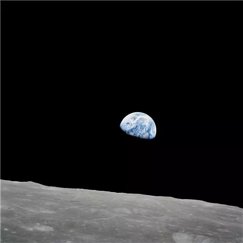 (阿波罗8号宇航员在绕月轨道上拍摄的地球图像。人类有史以来第一次亲眼目睹了自己居住的星球从另一个天体的地平线上升起。图片来源:NASA)
