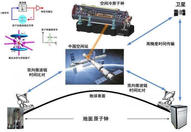 空间冷原子钟本身具有极高的精度,同时在太空中对其它卫星上的星载原子钟又可以进行无干扰的时间信号传递和校准,避免了大气和电离层多变状态的影响,从而使得基于空间冷原子钟授时的全球卫星导航系统具有更加精确和稳定的运行能力。