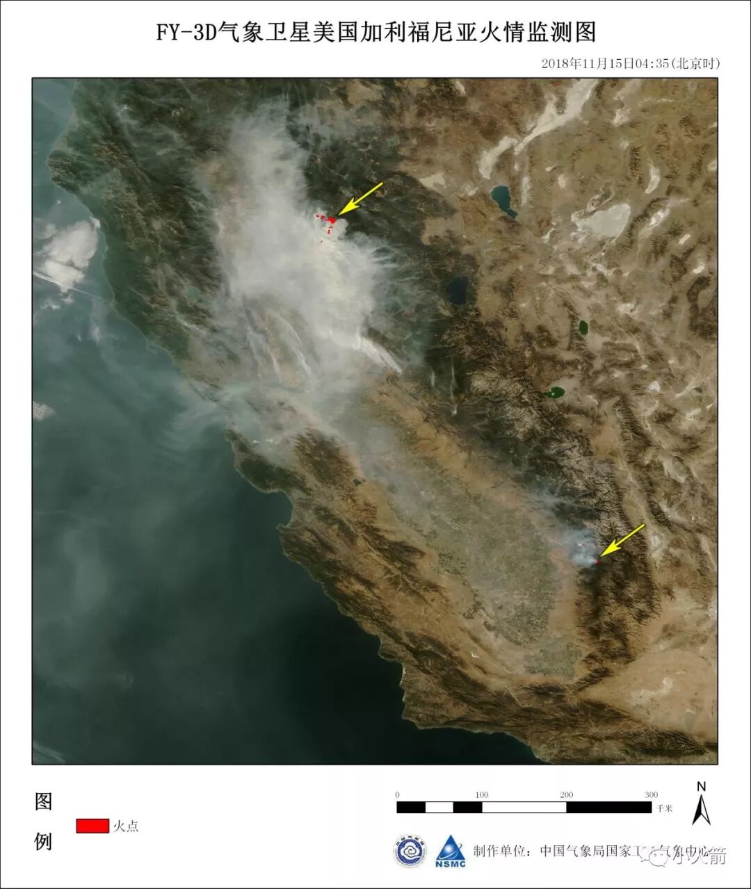 上图为风云三号D星太阳同步轨道气象卫星对美国加利福尼亚州山火的成像。摄于2018年11月15日北京时间04点35时。