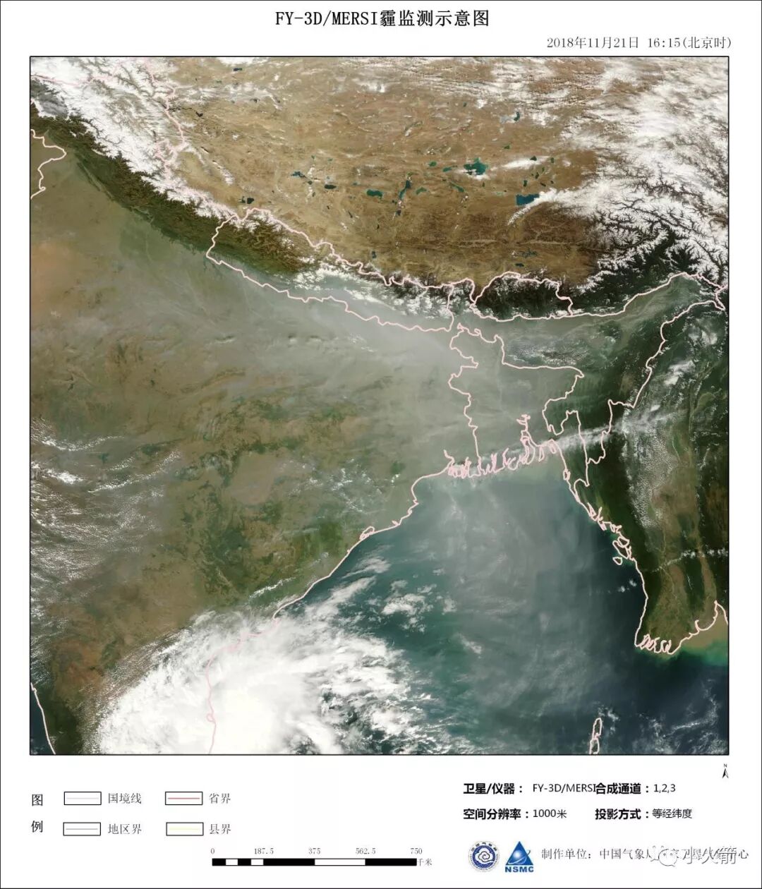 上图为风云三号D星对印度北部和孟加拉湾区域的成像。摄于2018年11月21日北京时间16点15时。