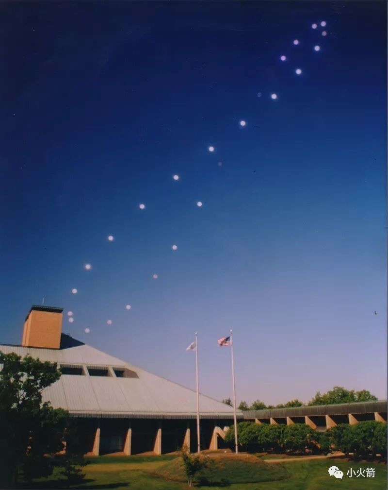 上图是在位于美国新泽西州的贝尔实验室外拍摄的日行迹,摄于1998至1999年,由多张在不同日期拍摄的影像叠合而成。