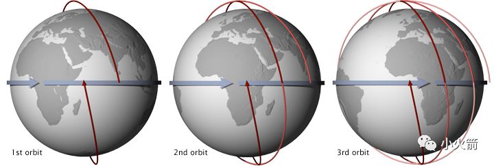 太阳同步轨道卫星在每天(和夜晚)大约相同的当地时间穿越赤道。这个轨道能够使得太阳和地球表面之间的角度保持相对恒定。上图从左至右依次展示了太阳同步轨道卫星的3条连续轨道,其赤道穿越时间都为下午1:30。