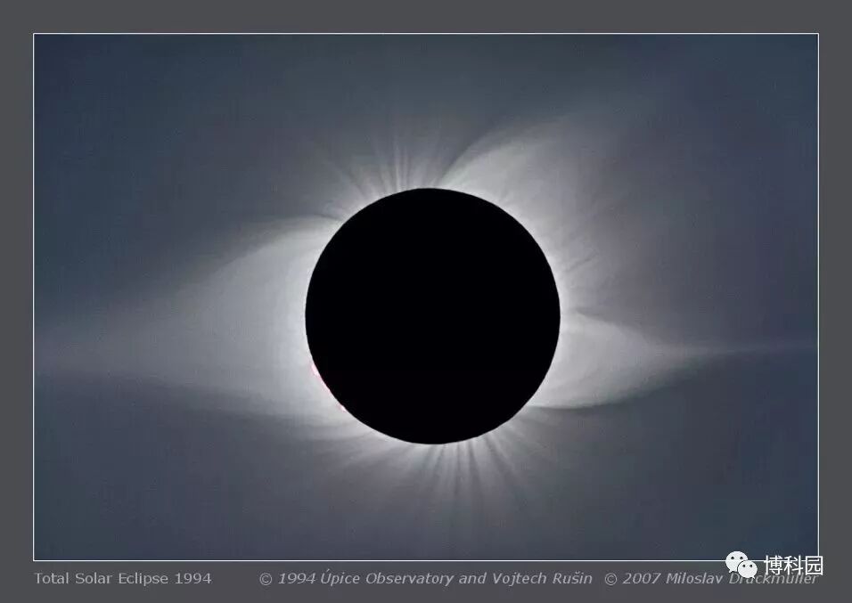 梅森用头盔上的彩带寻找日冕雨,就像这张图片左边的彩带一样。这张照片拍摄于1994年的日食期间,从南美拍摄。一个较小的伪流光出现在西翼(图像右侧)。由于它们与骑士的尖顶头盔相似而得名,头盔上的流线型延伸到遥远的太阳微弱的日冕中,当来自太阳明亮表面的光线被遮挡时,它们最容易被看到。图片:©1994 Úpice observatory and Vojtech Rušin, ©2007 Miloslav Druckmüller