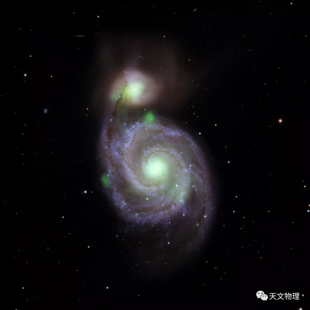 NASA核光谱望远镜阵列”(NuSTAR)任务捕捉到的明亮绿色高能x射线光源覆盖在一张漩涡星系(图片中央)及其伴星M51b星系(漩涡上方明亮的绿白色斑点)的可见光图像上。图片:NASA/JPL-Caltech, IPAC