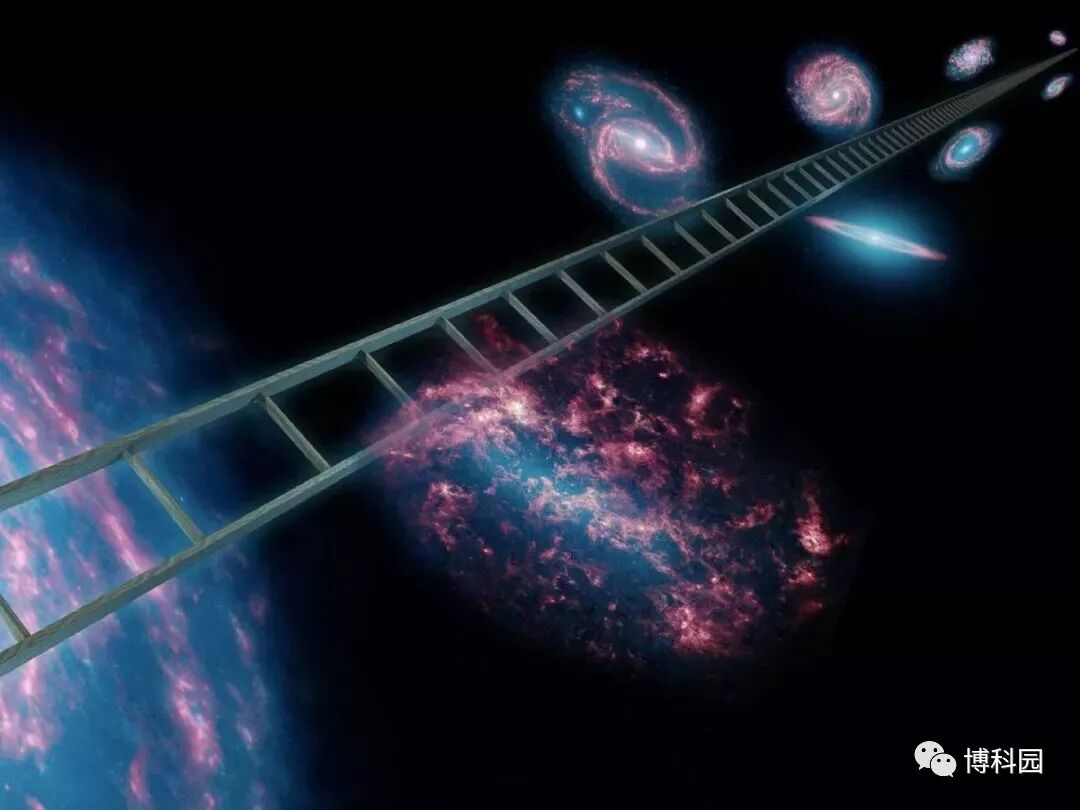 科学家使用宇宙距离阶梯来测量宇宙的膨胀率,梯子在这里象征性地显示,是一系列恒星和星系内的其他已知距离的物体。通过将这些距离测量数据与物体远离我们的速度相结合,科学家可以计算出膨胀率。图片:NASA/JPL-Caltech