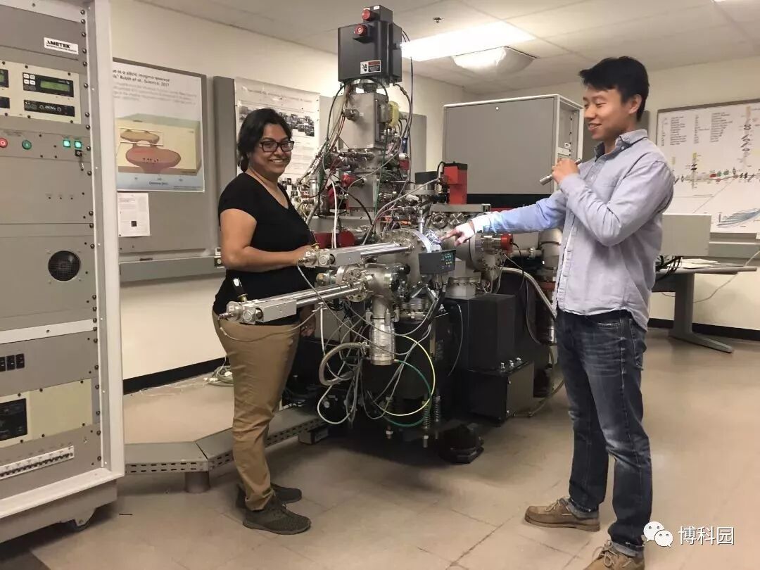 Ziliang Jin(右)和Maitrayee Bose(左)将Itokawa样品装入ASU的NanoSIMS 50L仪器的高真空室。图片:M. Bose