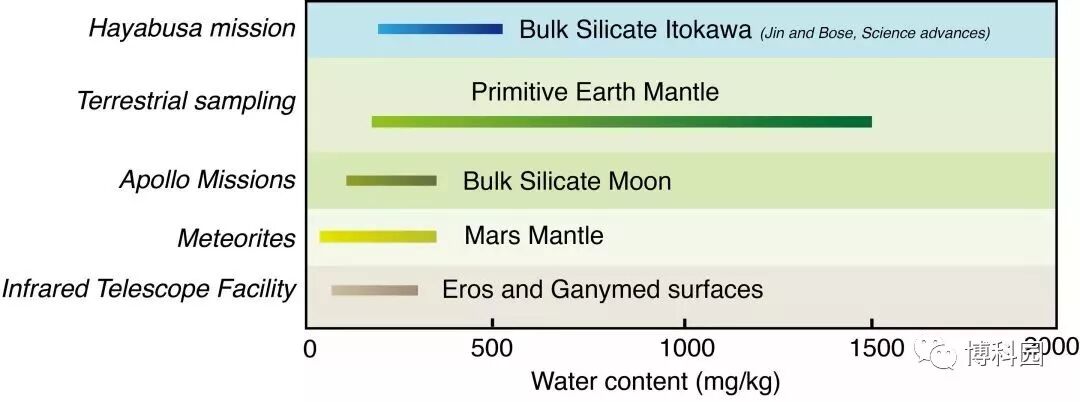 有代表性太阳系内部物体中的水,资料来源:Z. Jin和M. Bose。数据来源:Hauri et al。