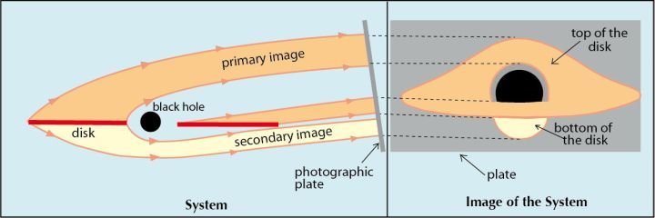 如上图所示,图中红色部分代表黑洞的吸积盘。如果观测和拍摄的方向是斜着侧对着黑洞的吸积盘(右侧灰色线段代表信号接收器),由于黑洞强大的引力弯折效应,吸积盘上方和下方的电磁波(光线)都可以被大幅度弯折,而到达右侧的接收器。所以侧面接收器接收到的图像(由右图显示)不是一个薄薄的吸积盘盘沿,而是在视界阴影上下很大范围内都有信号,其显示的形状和尺寸由黑洞的引力(时空弯折效应)分布决定。