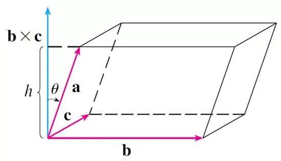 微分篇说过,两个矢量的叉乘的大小等于它们组成的平行四边形的面积,那么这个面积再和一个矢量点乘一把,你会发现这刚好就是三个矢量A、B、C组成的平行六面体的体积。