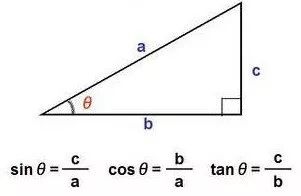 如上图,右边是一个直角三角形abc,那么角θ的正弦值sinθ等于对边c除以斜边a,正切值tanθ等于对边c除以邻边b。