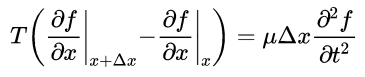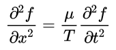 上面我们用我们已经用∂²f/ ∂t²来表示函数对t的二阶偏导数,那么这里自然就可以用∂²f/ ∂x²来表示函数对x的二阶偏导数。然后两边再同时除以T,得到方程就简洁多了: