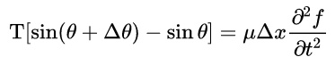 这样,我们就把牛顿第二定律F=ma的三要素都凑齐了:F=T·sin(θ+Δθ)-T·sinθ,m=μ·Δx,a=∂²f/ ∂t²。把它们集合在一起就可以召唤神,阿不,就可以写出AB的运动方程了: