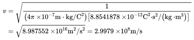 我们去查一下μ0、ε0的数值,μ0=4π×10^-7N/A²,ε0=8.854187818×10^ -12 (F/m),代入进去算一算: