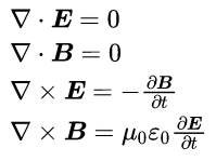 《最美的公式:你也能懂的麦克斯韦方程组(微分篇)》里已经做了详细的介绍,这里不再多说。这组方程里,E表示电场强度,B表示磁感应强度,ρ表示电荷密度,J表示电流密度,ε0和μ0分别表示真空中的介电常数和磁导率(都是常数),▽是矢量微分算子,▽·和▽×分别表示散度和旋度: