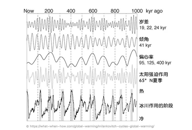 1920年,塞尔维亚地球物理学家米兰科维奇(Milutin Milanković)出版了专著《太阳辐射造成的热现象的数学理论》,详细阐述了有关地球公转与自转的各种参数及地球气候模式之间的关系,也就是后来著名的“米兰科维奇循环”。米兰科维奇发现有三个循环周期主要影响地球与太阳之间的关系,分别是偏心率、转轴倾角和岁差。在很长一段时间里,这个理论缺乏足够的证据支持,直到约半个世纪后,科学家开始有能力在海底等处进行取样分析,才找到了更多支持证据。全球气候的自然变化还有其他许多影响因素,而自工业革命后不可忽视的人为因素同样是目前学界的共识。