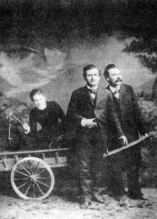 尼采,这位20世纪最伟大的,也是最有争议的哲学狂人,这位孤独、高傲、冷峻的思想者,他从来没有怀疑过自己的力量,而第二次向莎乐美求婚的失败,摧毁了他的自负和自信。不过,表面上,尼采的情绪似乎没有受到影响,他向莎乐美提议和保尔·里一起去照张相,作为他们友谊的见证。在摄影棚里尼采导演了一出喜剧:他让摄影师把一辆小推车推进布景中,请莎乐美跪在车上,他和保尔·里站在车前,用一条麻绳绑住两人的胳臂。又请摄影师找来一根棍儿做了一个鞭子,让莎乐美拿在手中。这样一来,尼采和保尔·里就成了拉车的马,被莎乐美拿着鞭子抽打着往前走。摄影师大声抗议,说这不成体统,可是尼采解释说,没有比这更好的姿态能表明他们三人目前的关系了。照相机咔嚓一声,留下了一个宝贵的历史镜头,也留下了一句尼采的警言:“你要到女人那里去吗?可不要忘了带上鞭子!”