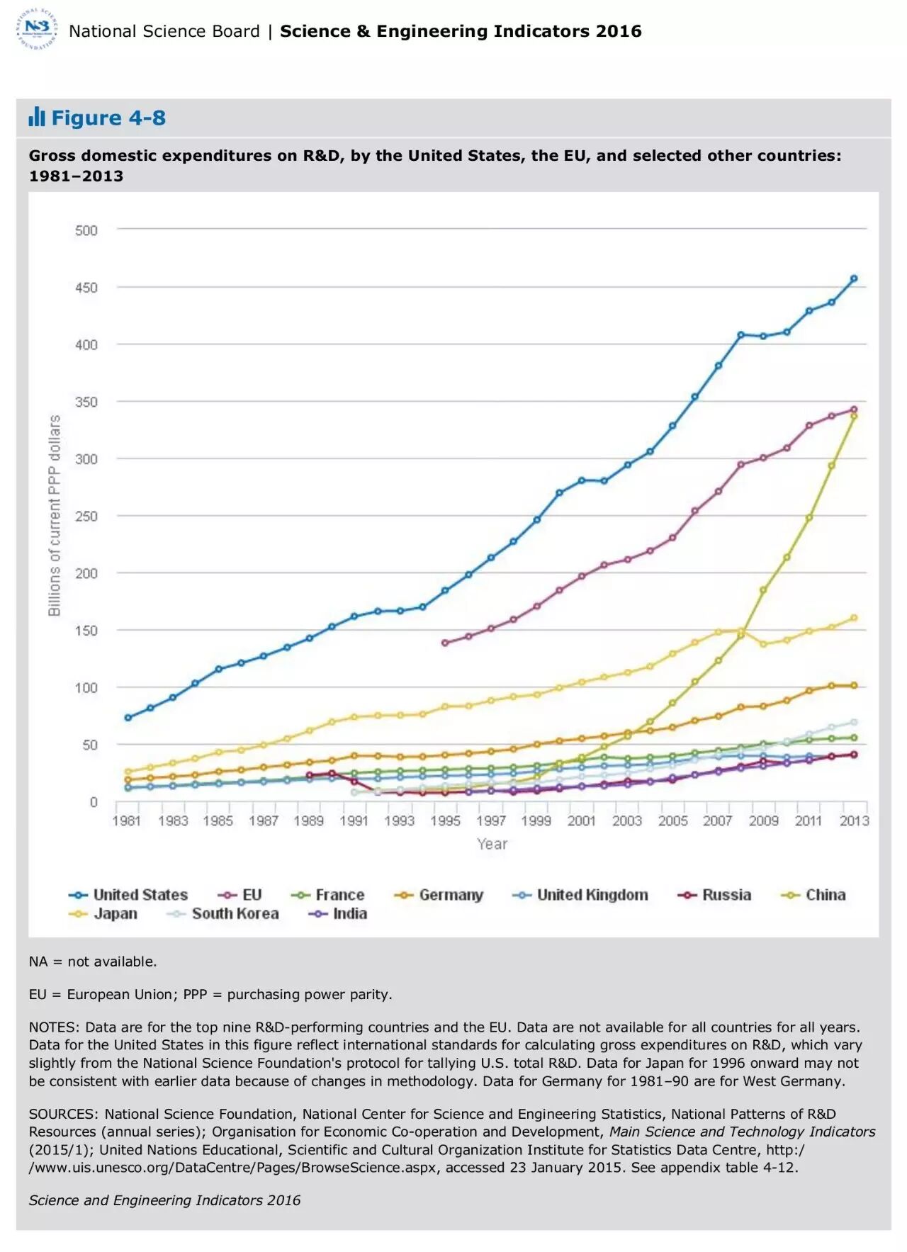 我个人非常同意还有许多其他科研项目也值得政府的大力支持,但我相信兴建巨型粒子对撞机并不会限制其他方面科学的发展。有时候我们容易忽略中国过去三十多年在科研发展的投入是不断提升的。翻看美国国家自然科学基金委员会提供的全球数据(Science and Engineering Indicator 2016,图4-8;最新数字截至2013年,使用更可靠的购买力平价PPP)[2] 显示,中国在过去数十年来,每年投入在科研的资源增长达到近百分之二十。2016年追平美国(达到每年近5千亿美元),甚至超越美国只是迟早的事。这增长是在人类历史上前所未有的。在未来5到10年内,中国在科研的投入预计能增加一倍以上,达到每年1万亿美元。在针对巨型对撞机政府需要花上大约每年5亿美元的预算下,平均每年巨型对撞机所耗用中国的研发预算其实所占不到0.1个百分比(千分之一)。兴建巨型粒子对撞机不会限制中国其他方面科学的发展。