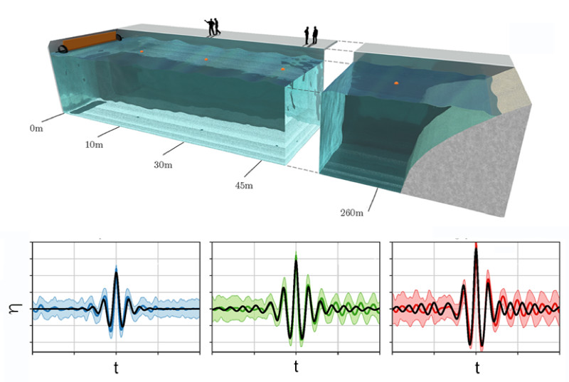 他们在一个用于进行巨浪实验的长约270米的水槽中,使用造波器来产生不同波长、相位随机的正弦波,以此来简单模拟海洋中的情况。在实验中,研究人员会记录下水面高度随时间的变化。