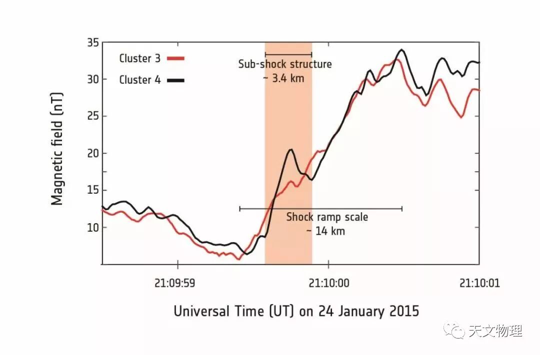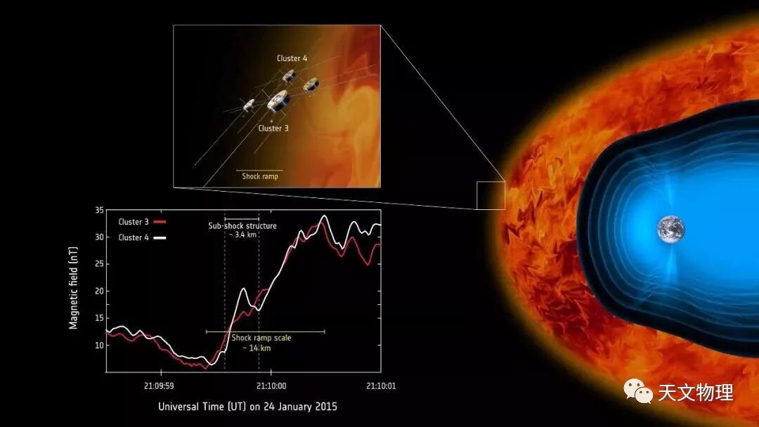 这些结构的大小只有几公里,类似于电子绕着磁场线旋转的尺度,它们位于激波中一个特别薄且可变的区域,在这个区域中,组成等离子体和周围场的性质可以发生最剧烈变化。欧洲航天局星团任务的项目科学家,该研究的合著者菲利普•埃斯库贝特说:弓形激波的这部分被称为激波斜坡,可以薄到几公里——这一发现也是基于几年前的星团数据。