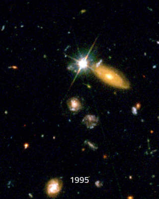 ○ 一些超新星所具有的亮度可以被用来测量它们与地球的距离,从而计算宇宙的膨胀率。箭头所指的是一个遥远的超新星,图中显示了1995和2002观测到了这颗超新星的变化。| 图片来源:NASA & J. Blakeslee