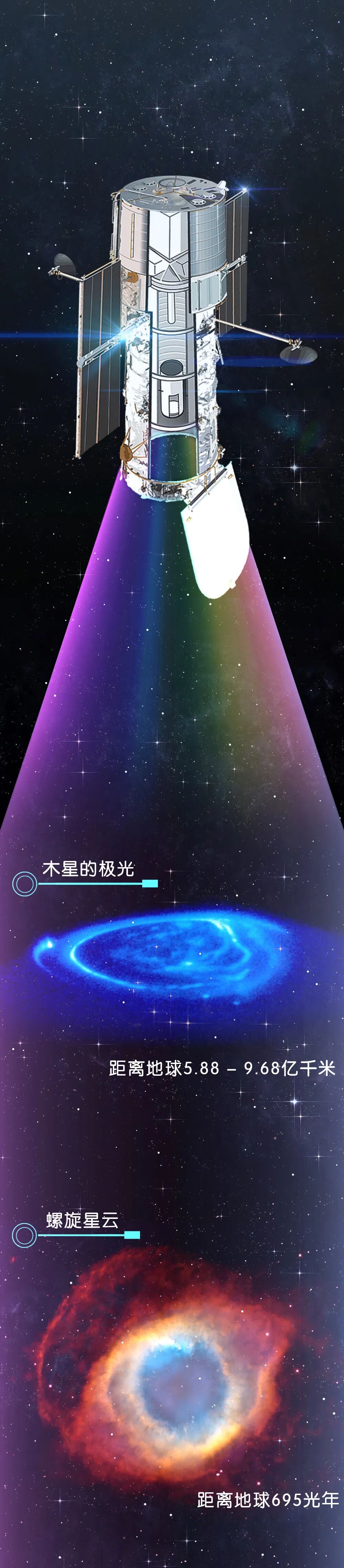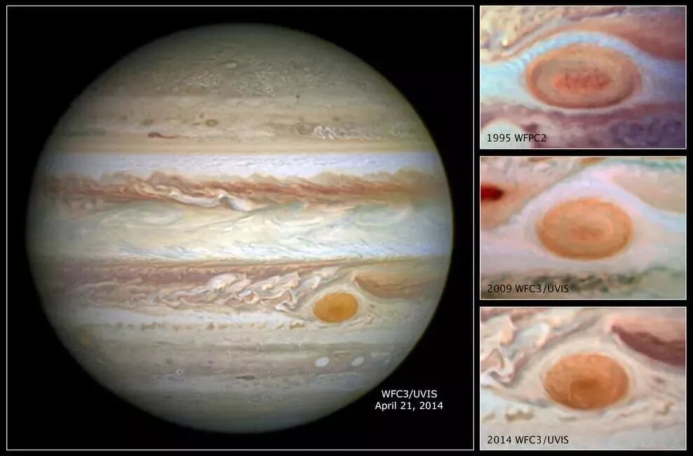 木星因它表面的大红斑而闻名,大红斑是一场巨大的风暴,大小与地球相当!在过去80年里,这场巨大风暴的规模一直在缩小。天文学家现在经常使用HST来测量这个红斑的大小,并研究它为什么正在慢慢消失。HST还拍摄到了在木星和土星的南北两极处的绚丽极光。